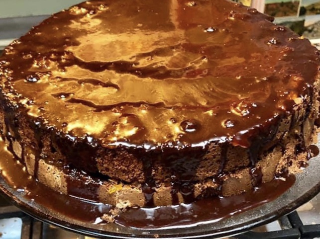 Take the cake out of the mold and let it cool. Once cooled, cut the cake in half horizontally using a piece of string. Fill it with a generous layer of apricot jam and put it back together. Then, cover all outsides with apricot jam and let it cool slightly.
