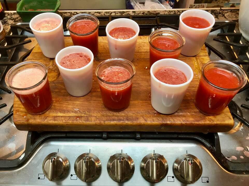 Pour cornstarch slurry into the strawberry mixture and heat up, stirring frequently. When the mixture thickens into a pudding-like consistency, begin to pour in the water, a little at a time. Do not add more water until the previous addition is mixed in evenly or you’ll get lumps. Continue until all of the water is added. Check for sweetness one more time. Add extra sugar if desired.