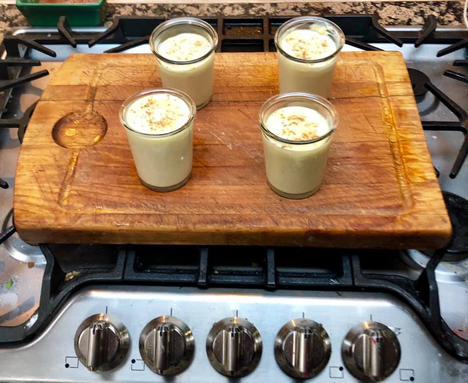 Chill until ready. Garnish with whipped cream, chopped fresh mango and grated nutmeg.