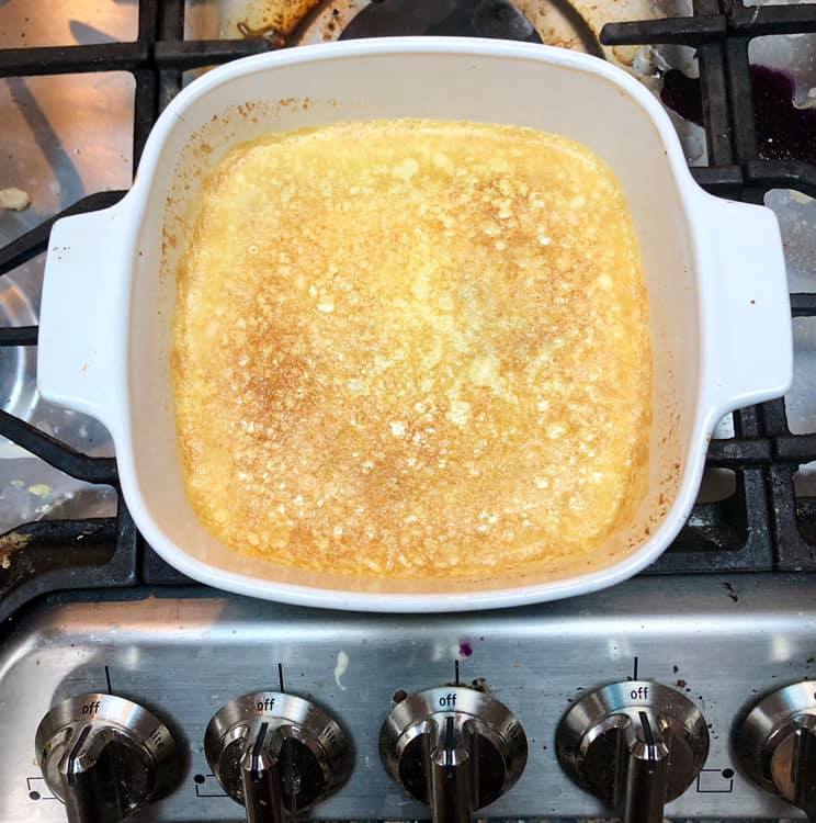 Sprinkle the bottom of a 8″x8″ glass baking pan with brown sugar. Pour the pudding mixture in. Place the baking pan in a larger pan with 2/3″ water and bake in the oven until it sets, check after about 30 minutes. Once set, remove from oven, cool and sprinkle with white sugar before serving.