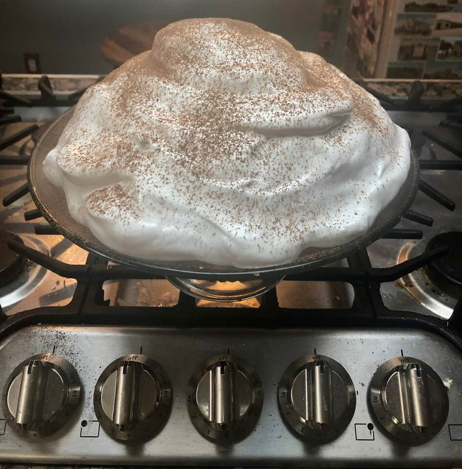 Cut the crust from the cake. Join both cakes filling-side in. Spread the meringue over the cake using a cake spatula.