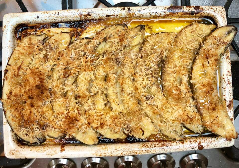 Bake for 20 minutes, basting regularly with the banana juice flowing into the baking dish.