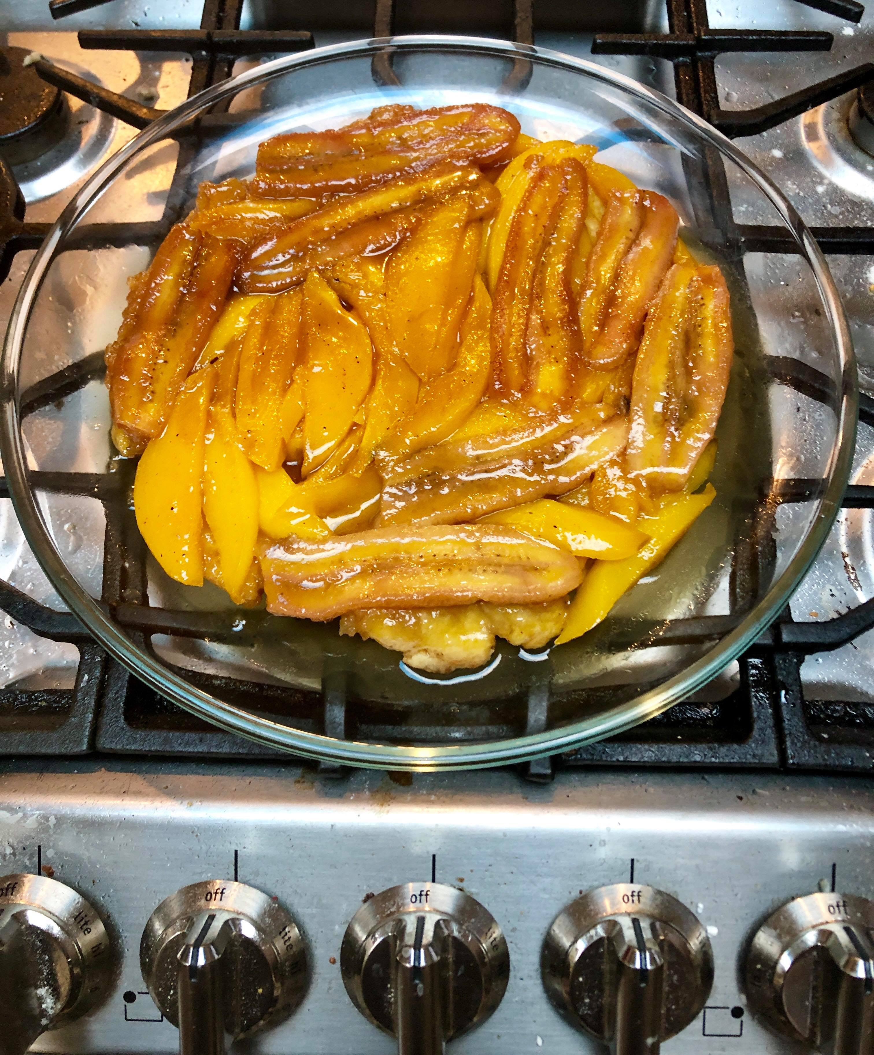 Add mango, vanilla bean and seeds, rum and nutmeg, then reduce heat to medium and cook, stirring gently to coat, for 10 minutes or until caramelised and slightly reduced. Add banana, turning gently to coat, and cook for a further 5 minutes or until banana is caramelised and sauce has reduced. Remove pan from heat and set aside to cool slightly.