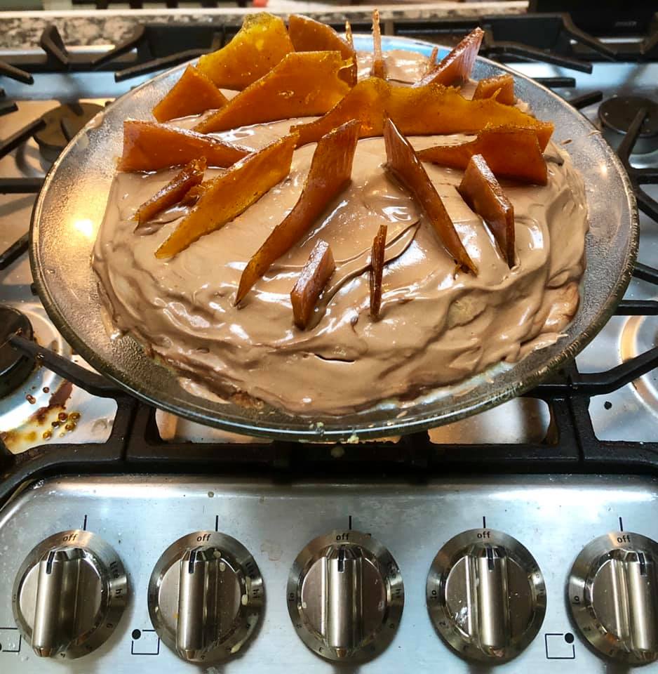 Cook sugar until is amber in color. Pour caramel over 1 of the reserved cake layers. Run edge of a chef’s knife in butter. With the help of the buttered edge knife, spread the caramel to cover the entire surface of the cake circle. Allow to cool to set the caramel. Cut into 12 equal pie cuts. Reserve.