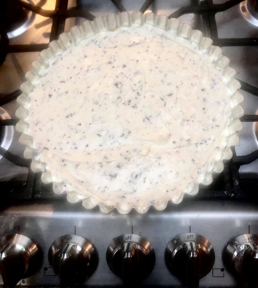 Melt the butter and mix it with the crushed biscuits. Press into a lined 9” tin to form a base.