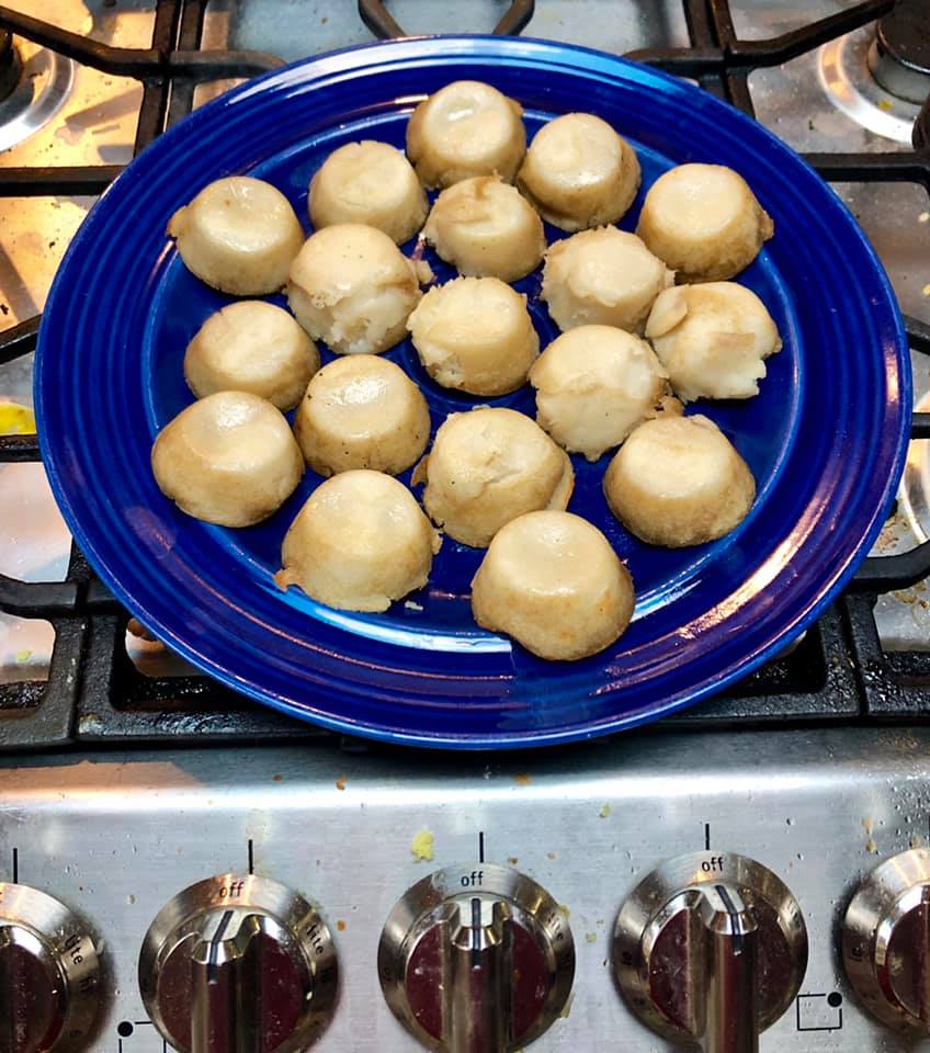 Using rice flour, it’s no surprise this has a mochi feel to it. They remind me of scallops when they come out of the pan. I cooked at 480…similar to a Yorkshire Pudding, but they don’t rise…