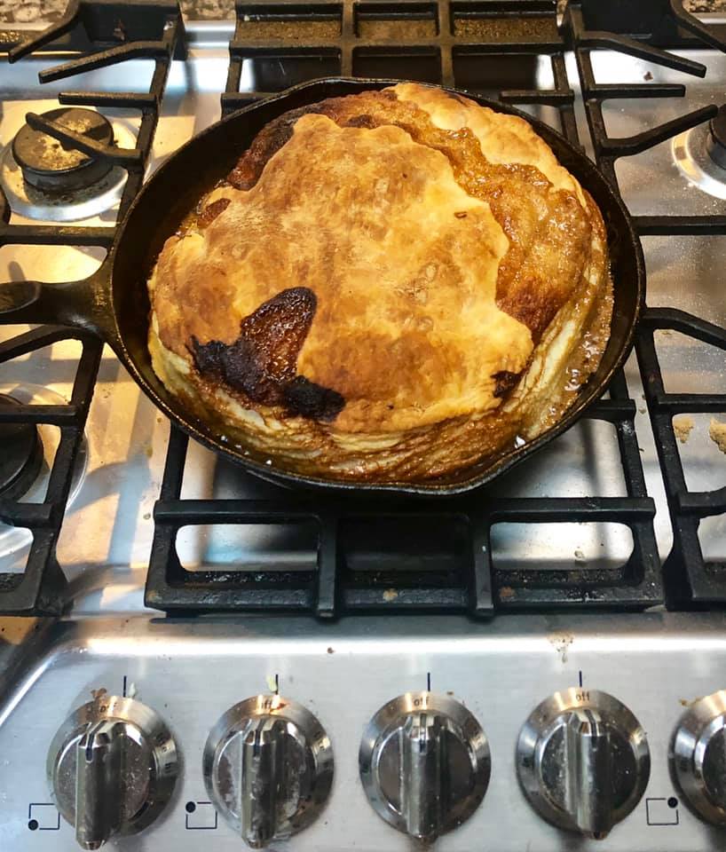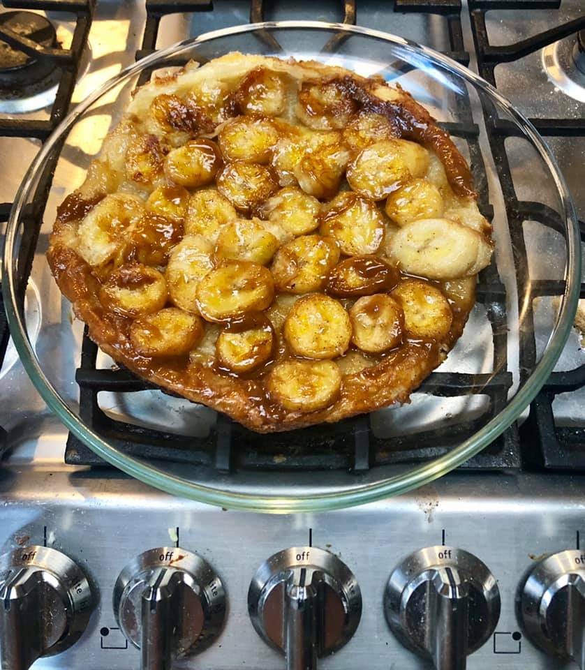 Drape the pastry over the bananas, fitting the overhang up the sides of the skillet.