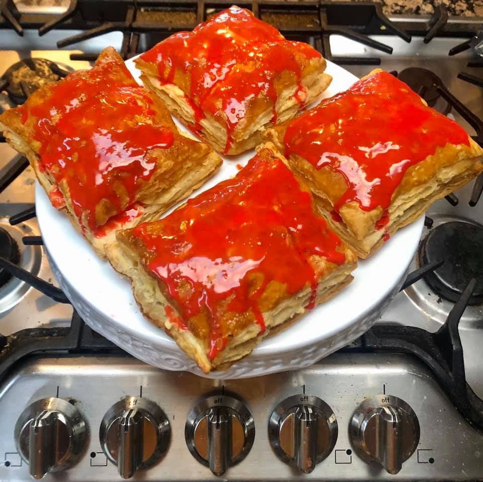 Take the bottom part of one of the baked puff pastries and spread the cooled down vanilla cream on it. Top it with its corresponding iced top half of the pastry. When all four are done, carefully spread the pink icing on top: let it dry and eat!