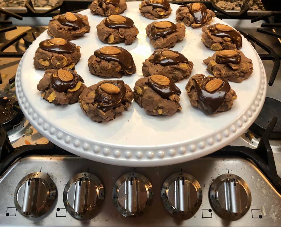 Sift together the flour and cocoa powder and mix into butter mixture with a wooden spoon. Fold in cornflakes and don’t worry if they crumble.